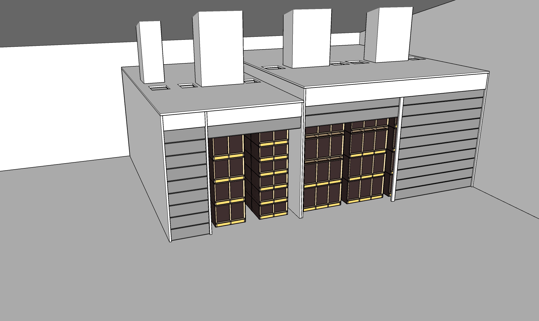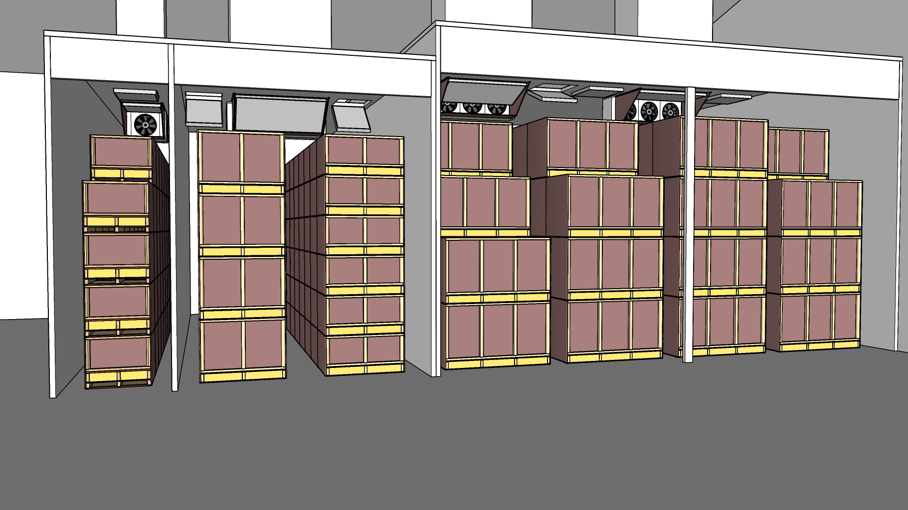 Afhankelijk van de behoefte en het gebruik worden de indeling en afmetingen van de cellen bepaald: 1 of meer rijen kisten per cel of 1 grote cel met droging aan twee zijden, 3-4-5-6 kisten hoog gestapeld. Volumes tot 30 of 40 m³ per rij zijn mogelijk.