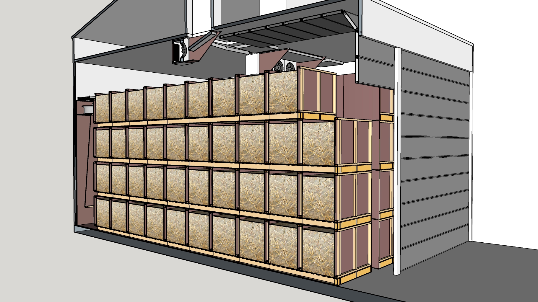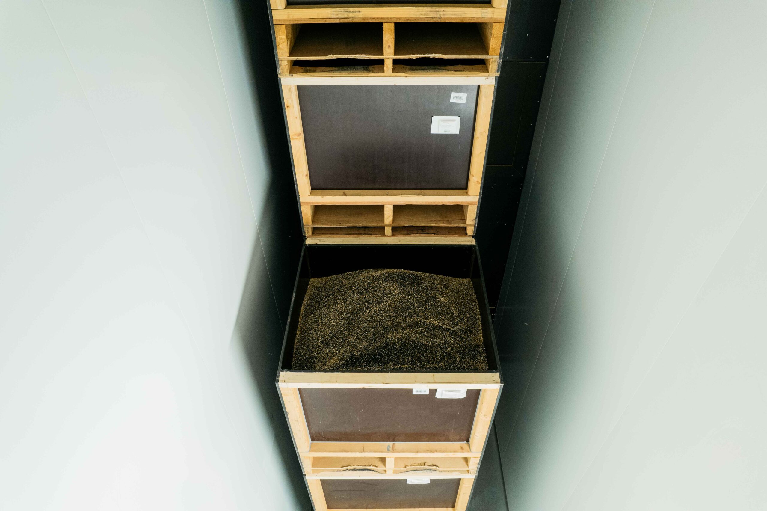 Geconditioneerd drogen geschiedt met gedroogde lucht. Daarom worden de kisten in een geïsoleerde ruimte geplaatst.