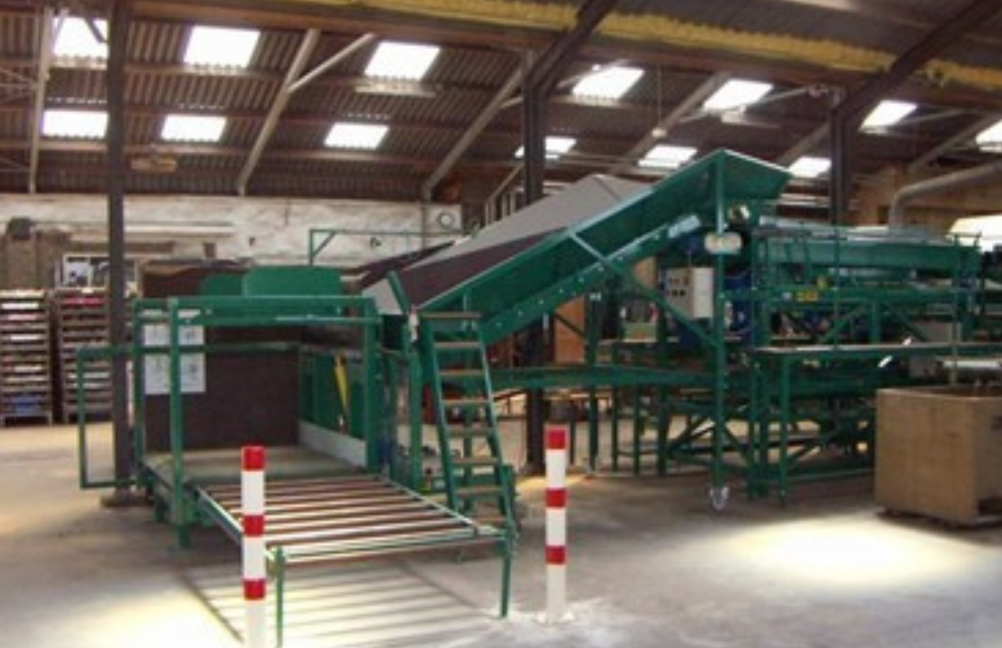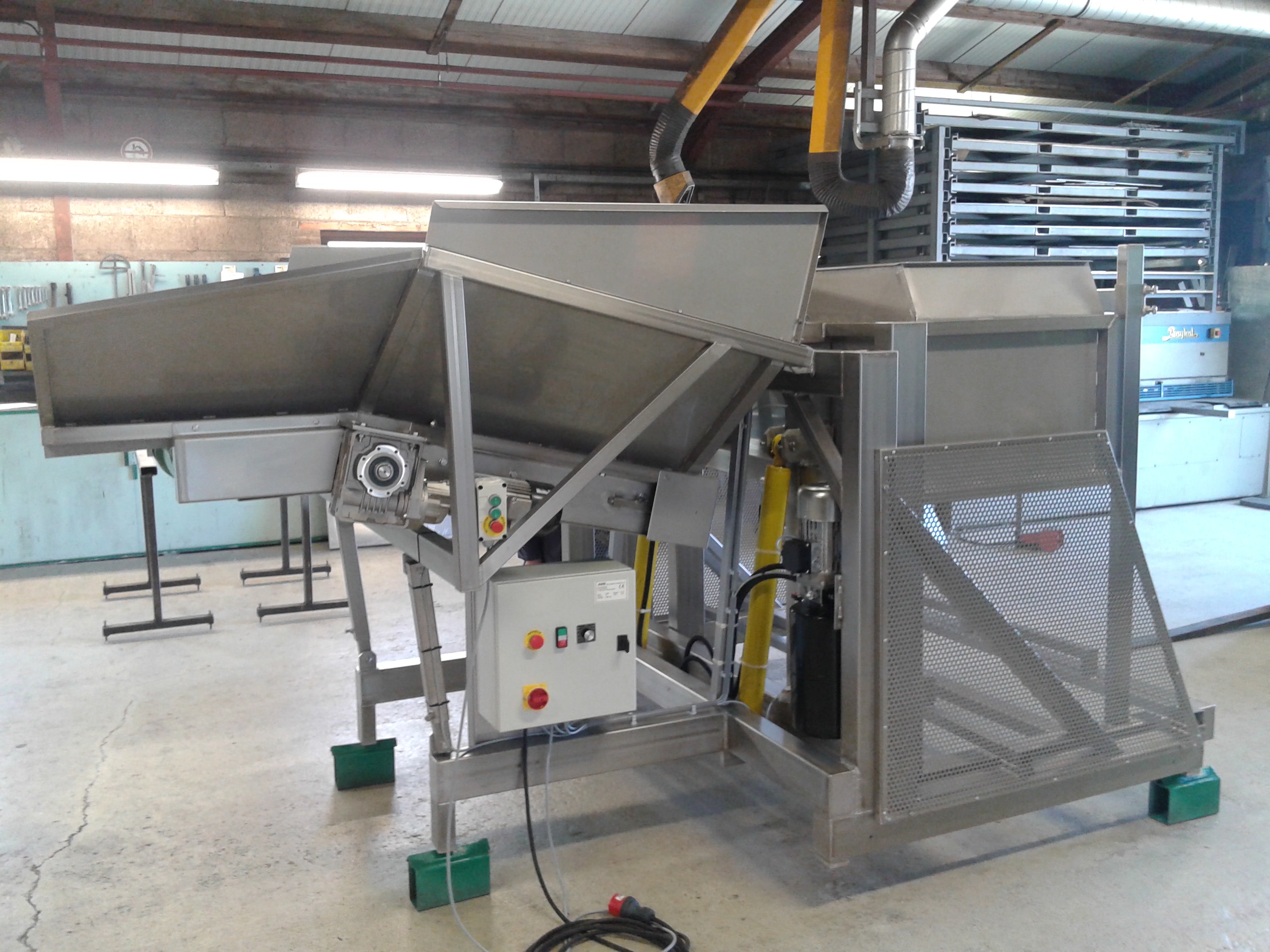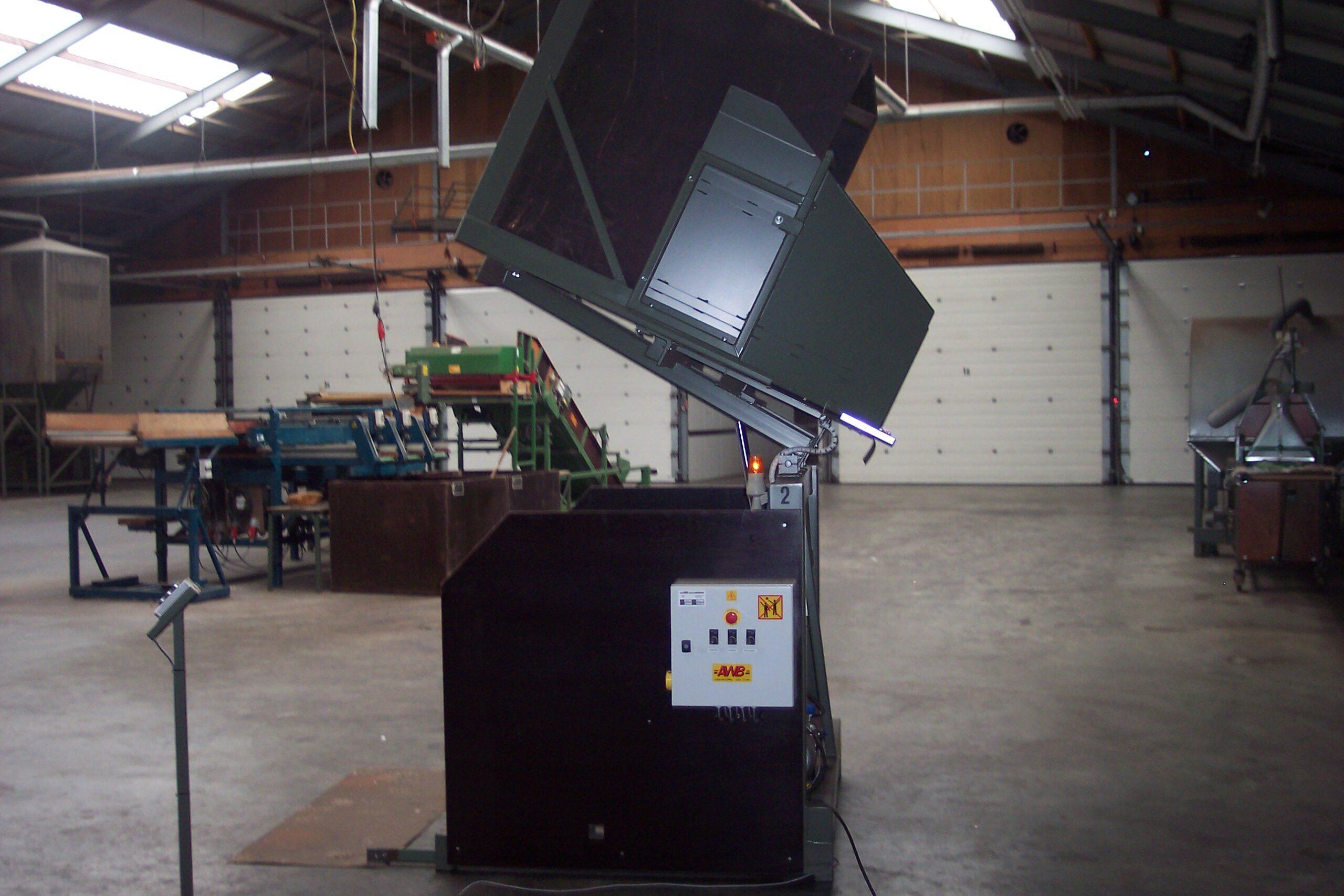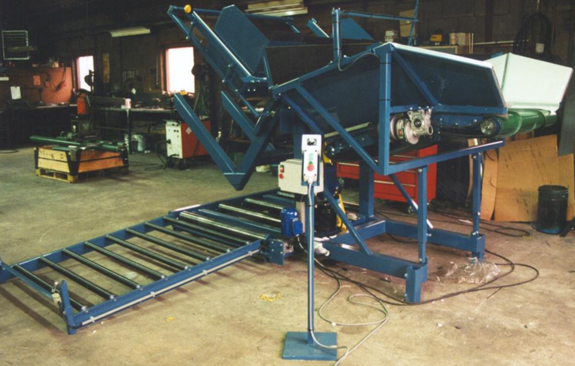 Om het wisselen van de kisten te vergemakkelijken wordt bij deze kantelaar de lege kist automatisch via een rollenbaan naar de zijkant afgevoerd. De kantelaar is dan direct vrij voor een volgende volle kist. Ook de aanvoer kan automatisch worden geregeld, waarbij dan een volle kist kan worden klaargezet in afwachting van de geleegde kist.